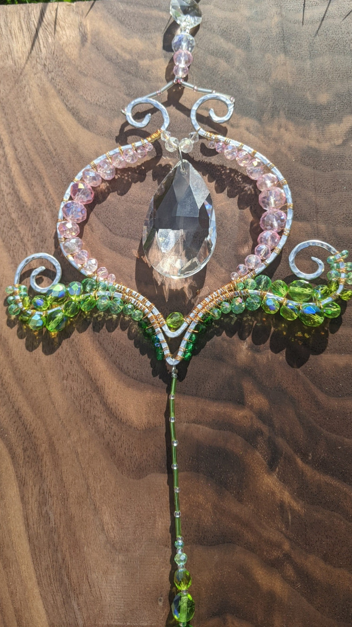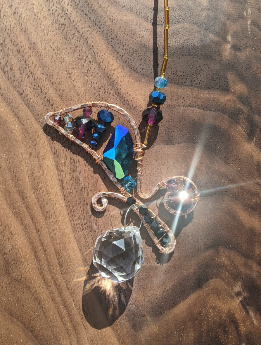 Each suncatcher includes K9 crystal prisms that create rainbows in the sun.